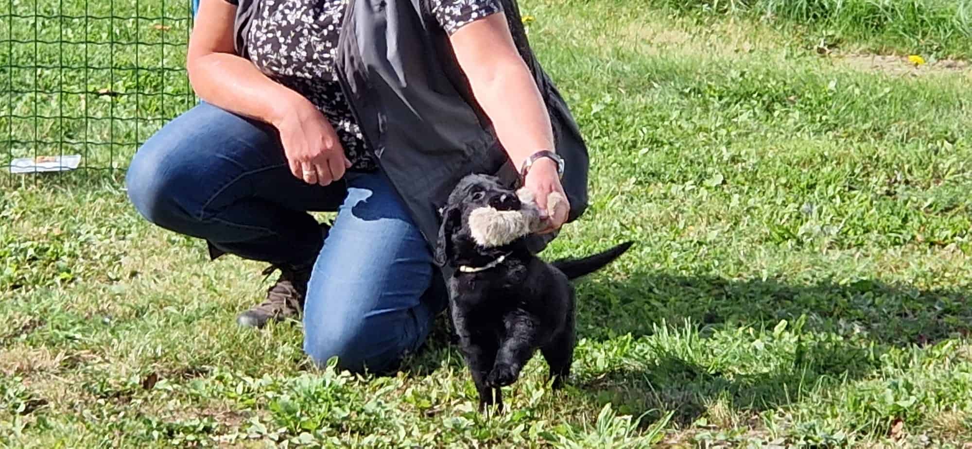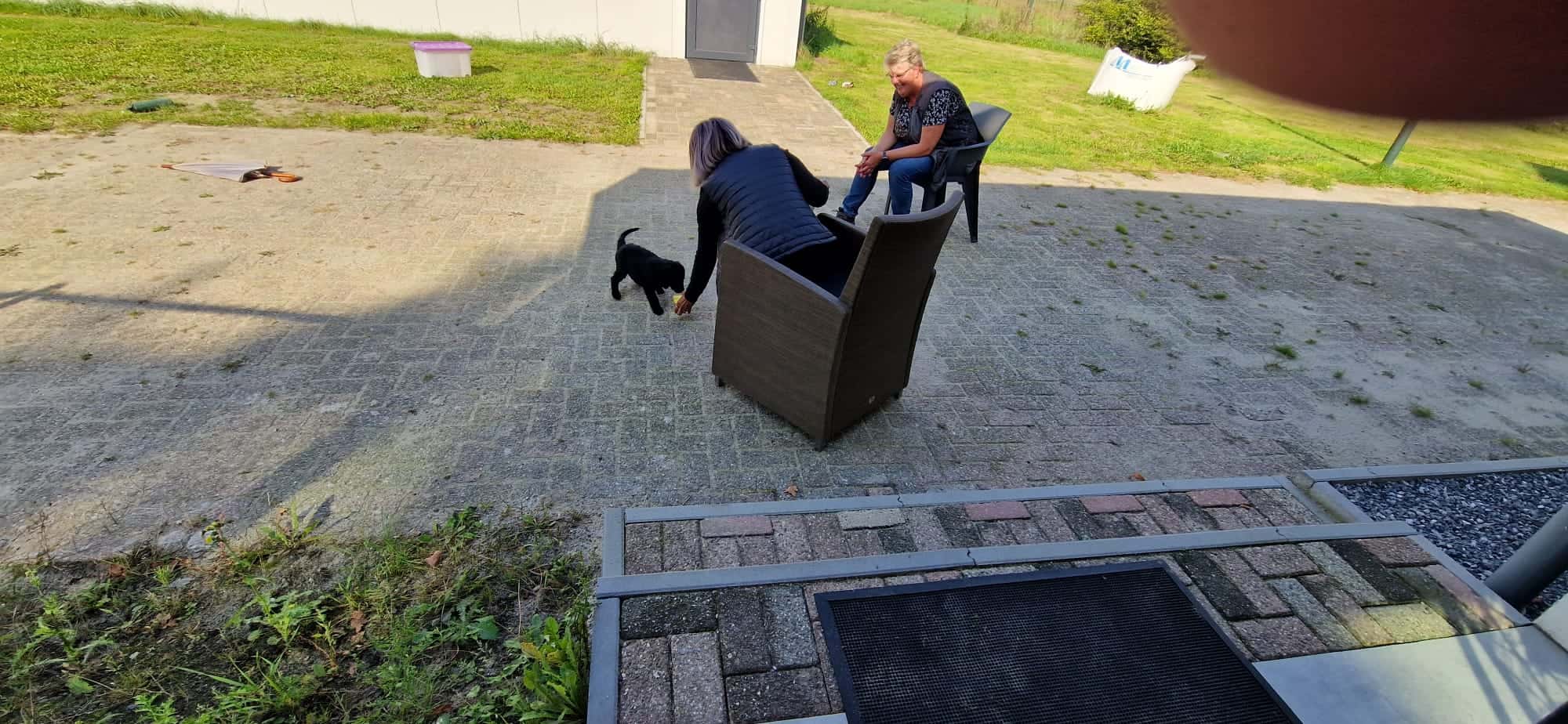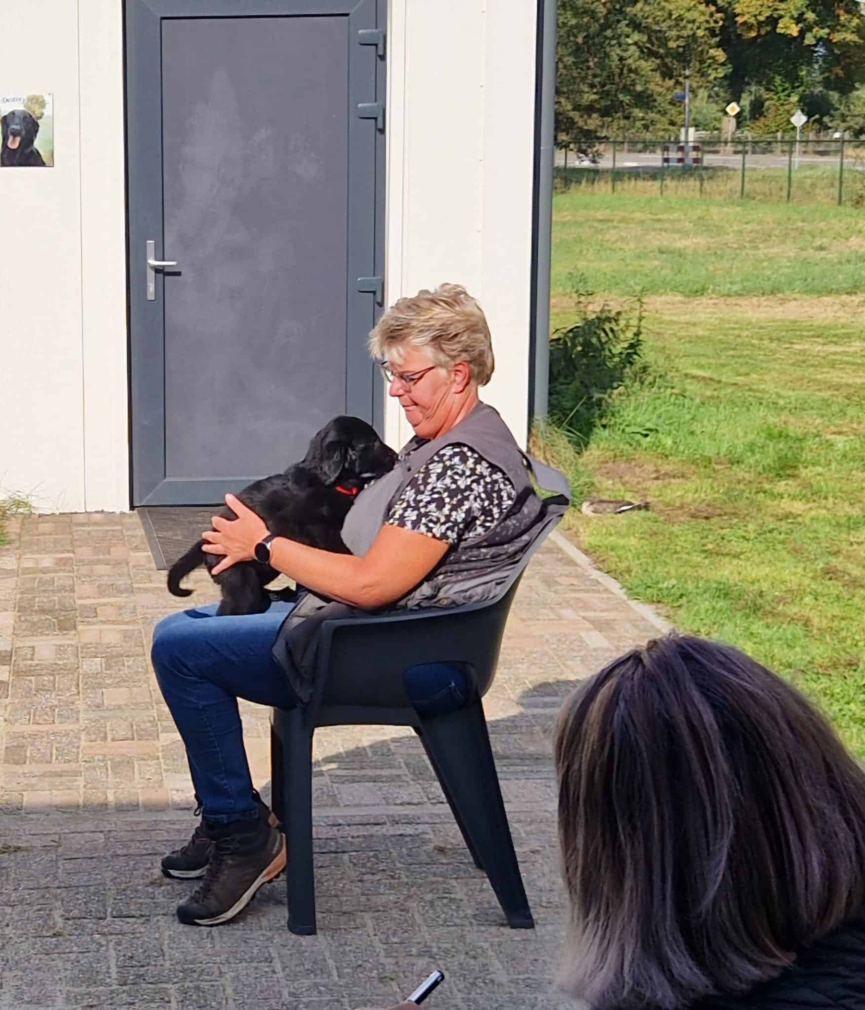 De pupjes zijn vandaag 7 weken en 2 dgn. Gister heb ik met Kyra en Vincent 4 rondes met ze gereden en telkens hadden Kyra en Vincent 1 pupje op schoot. De pupjes deden het geweldig en vonden het heel interessant, reutje grijs was de enige die een piepje heeft laten horen maar verder alles voorbeeldig. En dan vandaag de dag van de Puppytest van de FRC. Rond de klok van 10 waren Meta van de Glind en Gracia Lemmers hier om de pupjes vakkundig te testen. Ik was in het goede gezelschap van vriendin Simone die alle foto’s ook voor haar rekening heeft genomen. Het weer was ons uitermate goed gezind en de uitslag van de Puppytest ben ik ook zeer tevreden over: er zijn weinig verschillen tussen de pupjes, een homogeen nest en zeer mensgerichte pupjes en dat laatste is iets wat je heel graag ziet bij flatcoats. Doordat er zo weinig verschil tussen de pupjes zit, is het ook lastiger om de juiste match te maken. Morgen zal ik een beslissing nemen wie welke pup zal krijgen. Mijn jachttrainer Gerrit van Alphen komt hier morgen ook nog een keer naar de pupjes kijken, heel fijn, zeker voor de pupjes die jachttraining gaan doen. Vorige week hebben Marianne en ik ze al op hun uiterlijk beoordeeld en morgen komt ook Bianca en dan gaan we dat nog een keer doen voor de mensen die met hun hondje naar de show willen gaan.