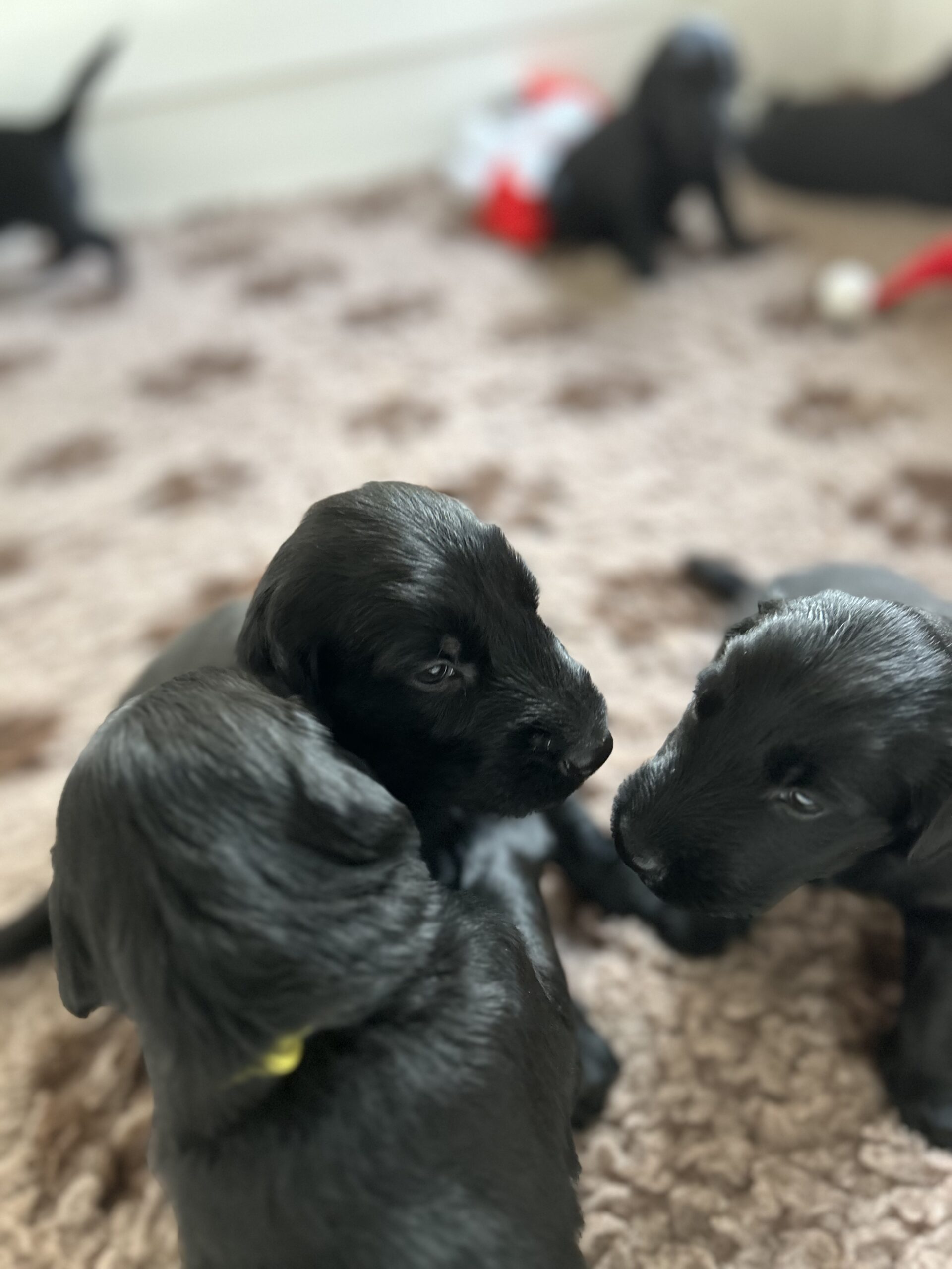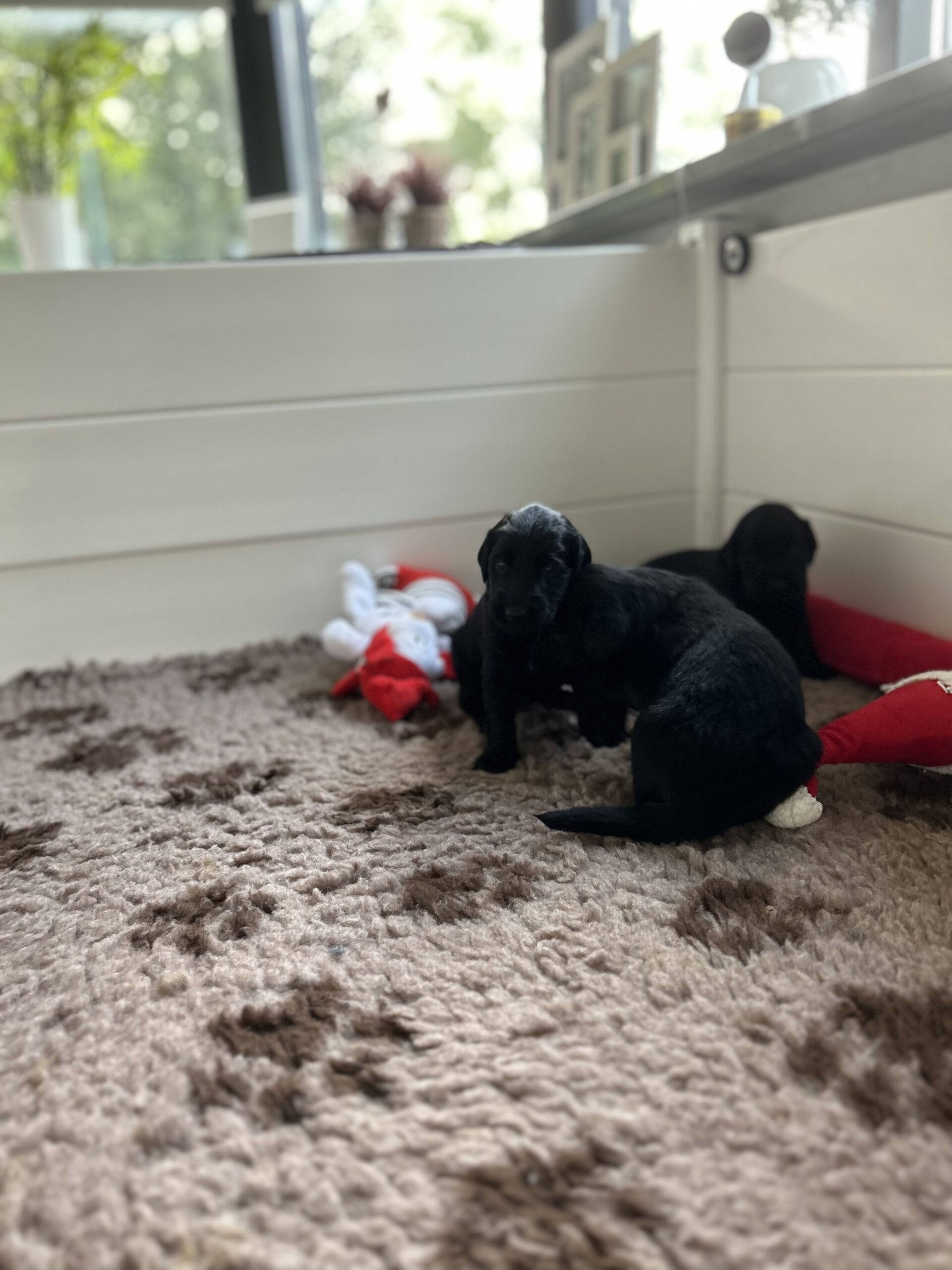 De pupjes zijn 3 weken en 3 dgn. De ontworming van afgelopen vrijdag was ze idd zwaar gevallen. Gelukkig sinds vandaag weer betere poepjes maar het was me een smeerboel in het weekend. De kleintjes hebben nog niet het vermogen om het ergens in een hoekje te doen, nee hoor als we het voelen dan moet het eruit en of dat nou over een slapende broer of zus is of over een knuffel dat maakt allemaal niet uit. Dus heel veel gesopt en schoongemaakt zodat Dakota ook nog normaal bij haar kindjes kon liggen. De grote verhuizing gaat vnv plaatsvinden want pupjes die de darmpjes van slag hebben, laten we liever even met rust. Gelukkig had hun levendigheid er niks onder te lijden en ze kwamen ook nog gewoon aan maar wel minder dan normaal. Zaterdag hebben ze hun 1e balletje tartaar gehad en dat vonden ze een feestje, het balletje werd gretig naar binnen geslurpt. Vanaf morgen krijgen ze 2x per dag een balletje en vanaf woensdag krijgen ze kleine portie Carnibest Puppy.