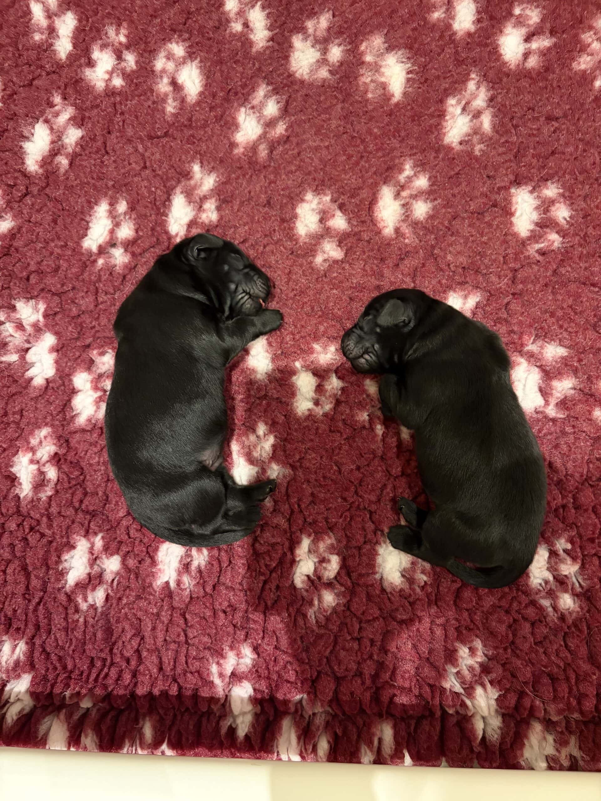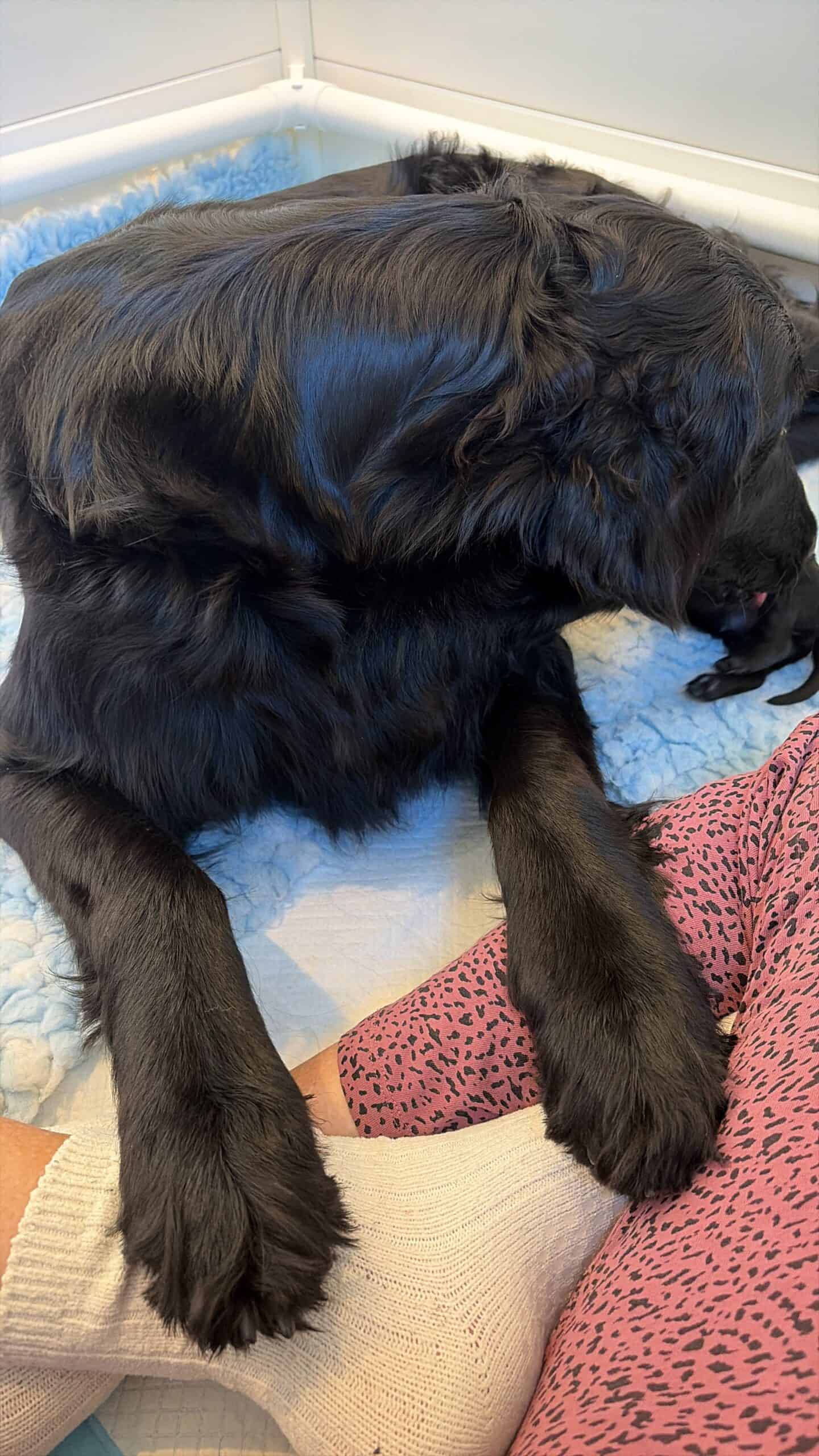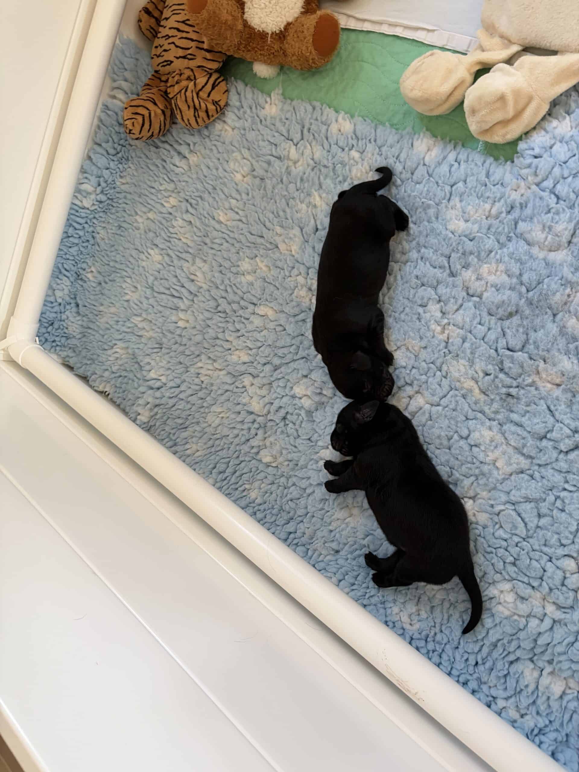 Het is vandaag de 4e dag na de geboorte van de puppies en het gaat super goed. De 2 kleintjes groeien als kool maar dat is niet zo vreemd als je tien tepels tot je beschikking hebt. Nayeli is een geboren moeder, heel zorgzaam en lief voor haar kindjes. Ze krijgt 3x per dag Energique puppy, karnemelk, gekookt ei en ook nog Hüttenkäse met slagroom en dat allemaal voor goede melk voor haar pupjes. Ze vindt het ook super leuk dat ik ’s avonds de matras voor de ingang van de werpkist leg en gezellig bij haar slaap.