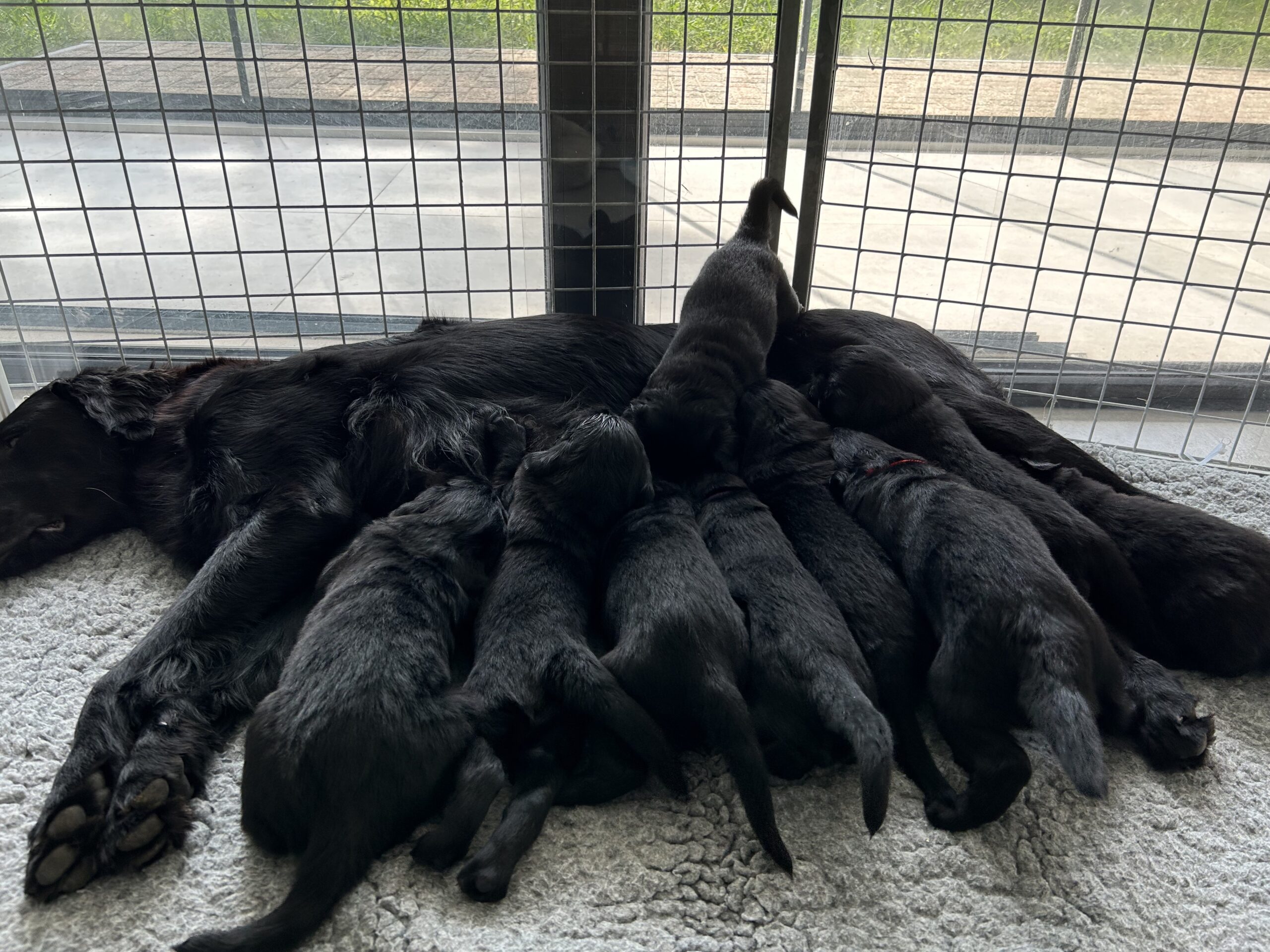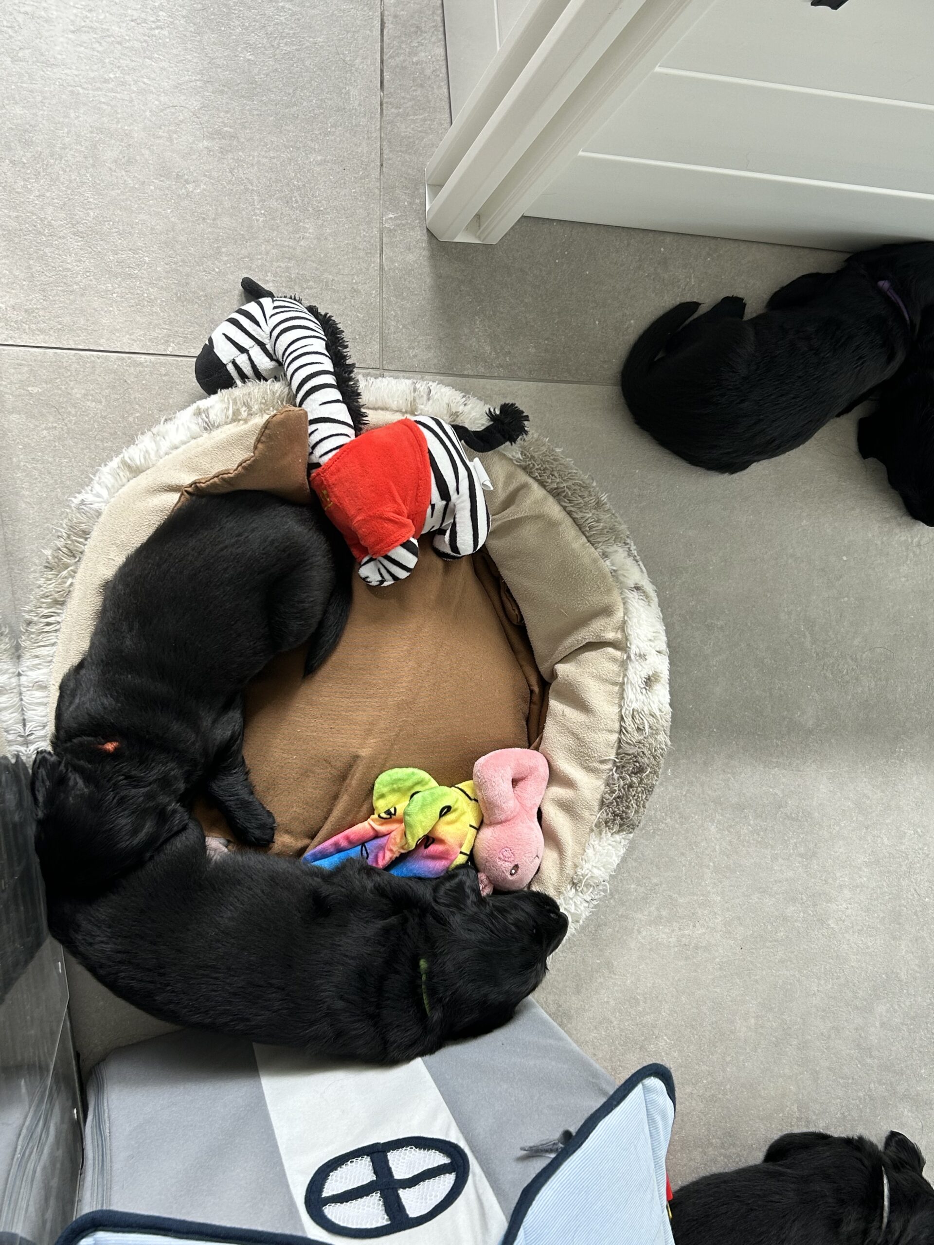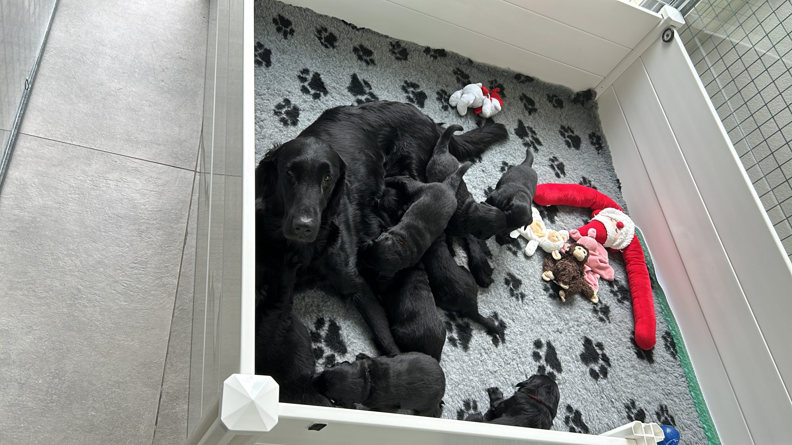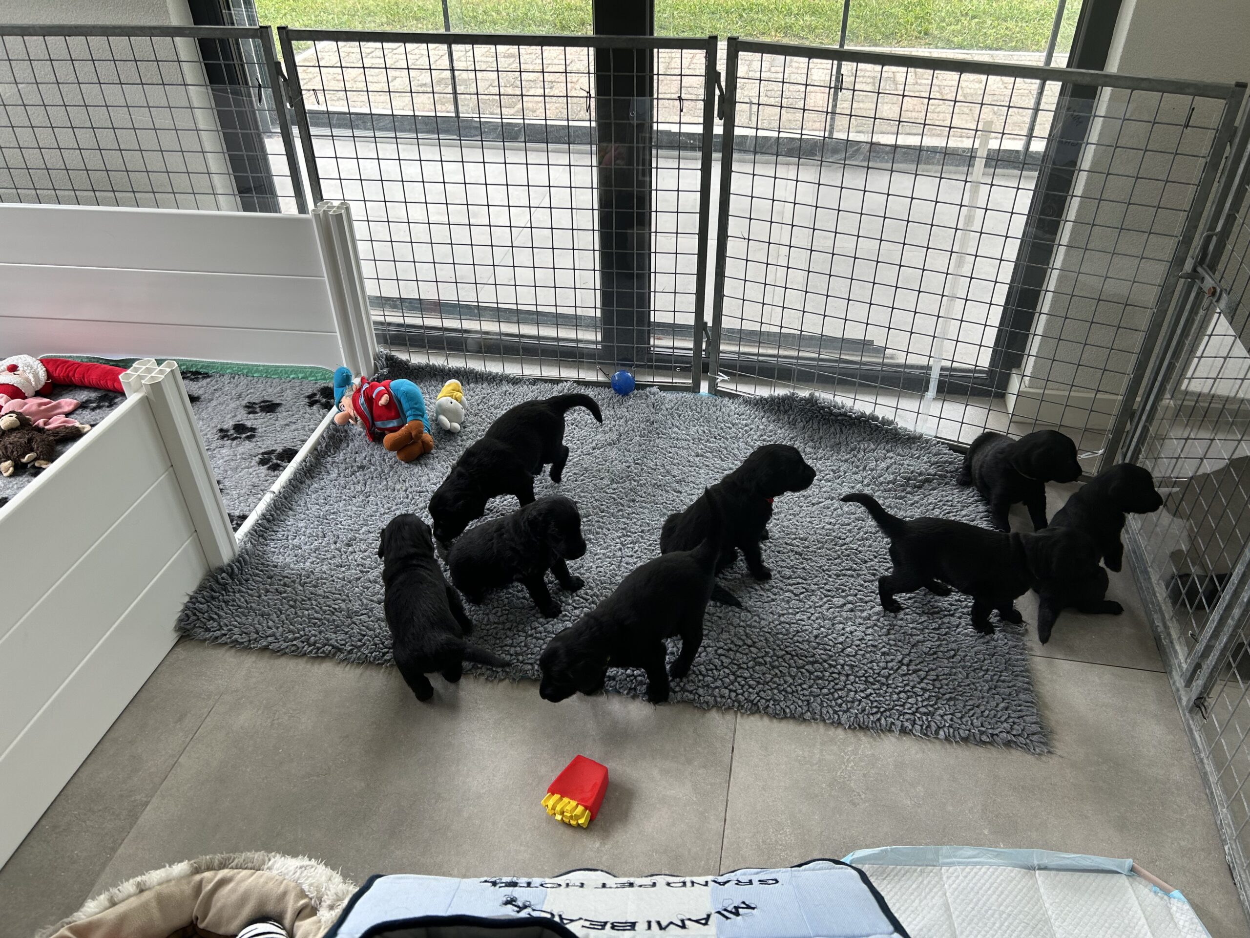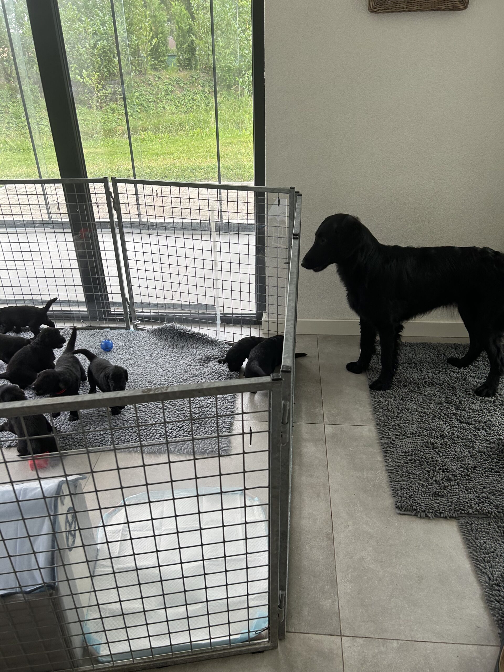 Vandaag zijn de pupjes 4 weken oud. Ze doen het super goed en hebben sinds ik maandag het Dagboek bijgewerkt had een prima week gehad in tegenstelling tot de rest van de familie. Het is maar goed dat de puppies er niks van gemerkt hebben maar het was hier een hele verdrietige toestand met het overlijden van River woensdag. Dakota was over River net zo waaks als over haar kindjes want toen de dierenarts woensdag binnenkwam, gromde ze naar hem. Hij mocht wel naar haar kindjes kijken, dat was weer een meevaller. De dierenarts dacht dat ze al 4,5 week waren maar toen vertelde ik dat ze vandaag pas 4 weken zouden worden, hij zei toen tegen Dakota: jij hebt goed werk geleverd:). Dakota zorgt nog steeds geweldig voor haar kindjes maar ze is duidelijk aangedaan door het verlies van River, zij is natuurlijk ook de enige van de roedel die het hele proces heeft meegemaakt. Dit weekend komt er heel veel puppyvisite dan zal Dakota heel veel afleiding hebben. De puppies zitten sinds gisteren in de puppyren en dat vinden ze helemaal geweldig. Ze stappen rond alsof ze nooit anders gedaan hebben. De balletjes tartaar hebben plaatsgemaakt voor Carnibest Puppy en dat wordt met veel smaak naar binnen geslurpt. Ze krijgen nu 2x per dag een beetje Carnibest en verder nog steeds de melk van Dakota. Volgende week donderdag, 5 september komt de Chipper van de Raad van Beheer en dan heeft ook ieder hondje zijn eigen stamboomnaam. Dinsdag 17 september komt mijn dierenarts om ze de 1e vaccinatie te geven en helemaal te controleren. Waar de eerste 4 weken relatief rustig waren, worden dit 4 hele volle weken. Vanavond ga ik voor het eerst sinds de bevalling weer eens in een bed slapen, nog niet mijn eigen bed maar het logeerbed want dan hoor ik de puppies beter en ik moet er in de nacht toch nog steeds uit om Dakota bij ze te laten zodat hun buikje weer gevuld is met moedermelk. Dakota slaapt verder gedurende de nacht heerlijk bij me op een zacht kussen op de grond.