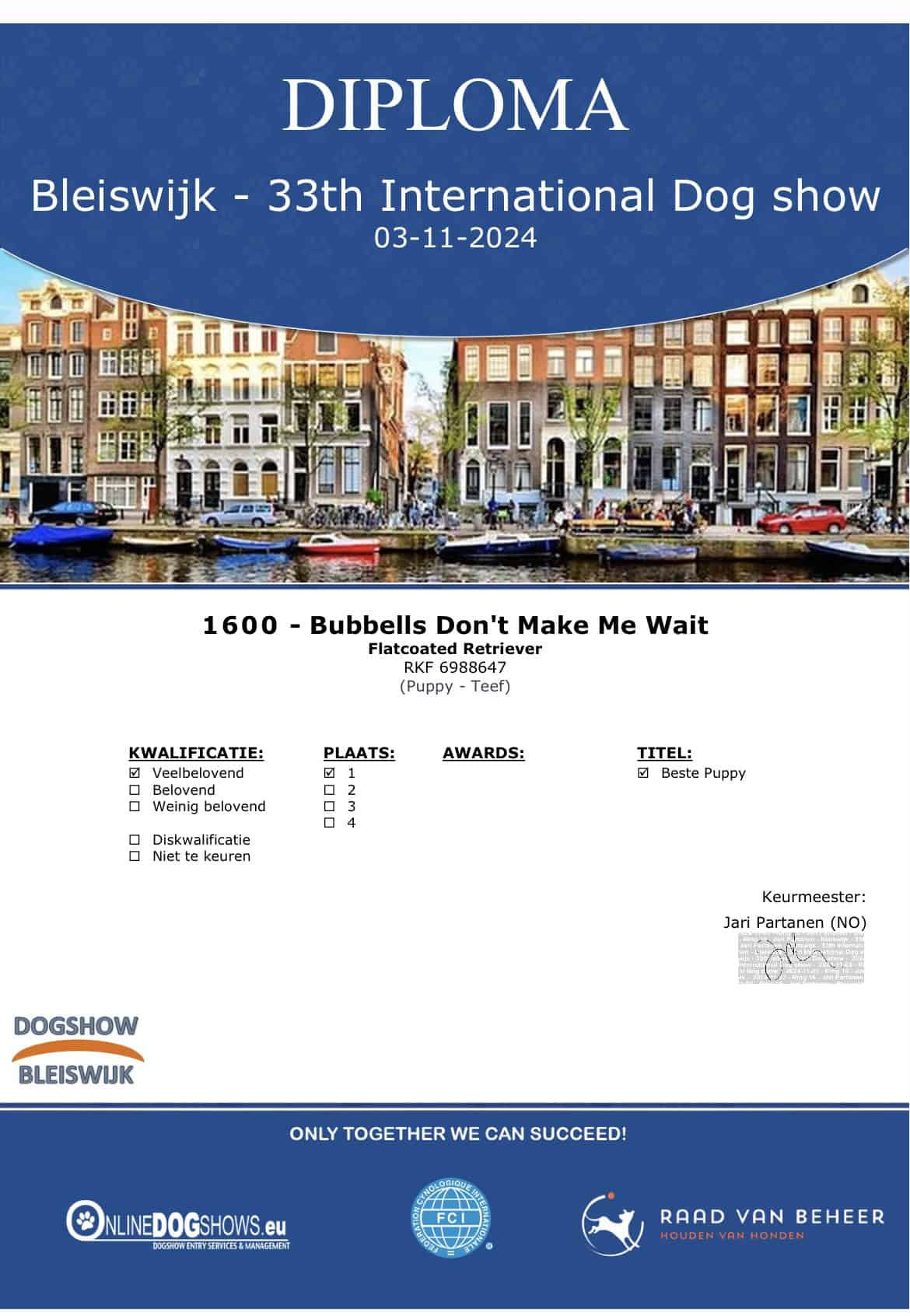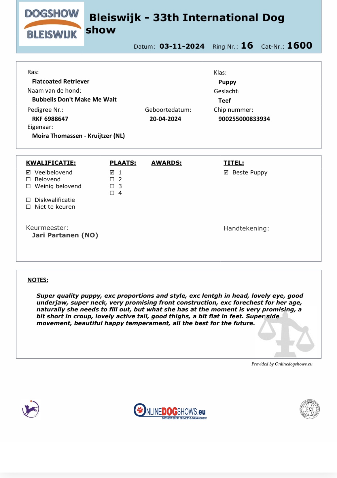 Zondag 3 november was het de 1e keer dat ik met ons lieve, 6 mnd oude, Russische meisje Jennah(Bubbells Don’t Make Me Wait) naar de show ben gegaan. Bij de Internationale Dogshow in Bleiswijk haalde zij in de Puppyklasse een 1e plaats VB(VeelBelovend) en werd tevens Beste Puppy.